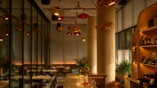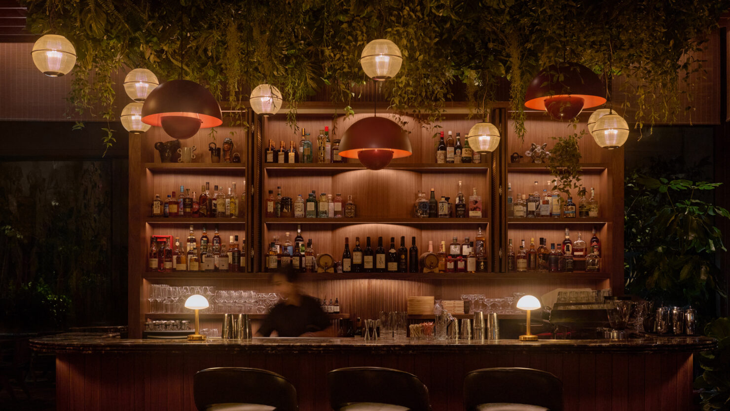 Upstairs in Kaya, the main restaurant and cocktail bar, darkness is carefully curated to create a mood rich with nuance and drama. Cove lighting deepens the texture of embroidered wall surfaces, discreet spotlights animate ceiling-hung greenery, and layered accents bring warmth to the bar. Floating glass globes and retro pendants add colour and character, weaving a final layer into the urban-garden narrative.