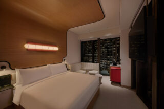 The story begins in the lobby, where subdued, atmospheric lighting heightens the sense of arrival. Diffuse lines of light trace timber surfaces and floating greenery, while a sculptural chandelier frames artist Eric Tobua’s oversized terrarium reception counter, a playful nod to The Standard’s Hollywood origins.