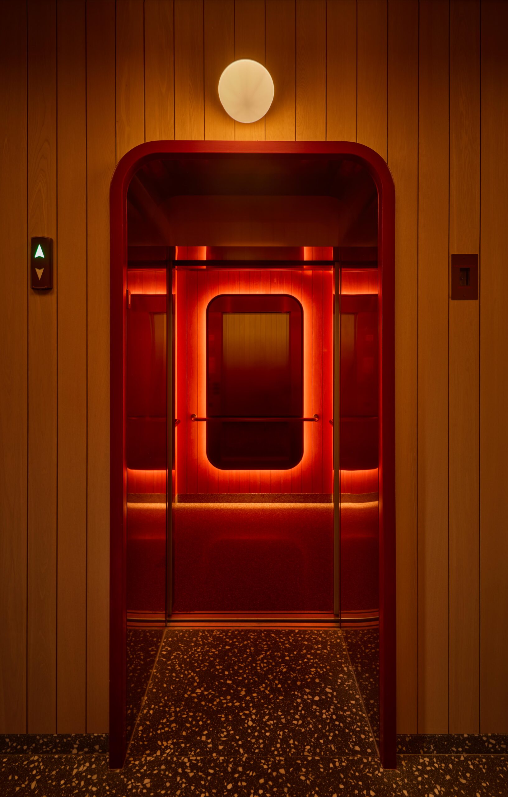 At the far end of the lobby, the lift area becomes one of the hotel’s most playful, cinematic moments. Concealed lighting frames mirrored walls and punchy red panelling, transforming a simple transition into a vibrant visual experience.